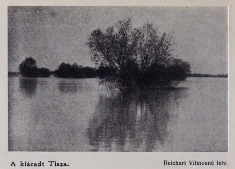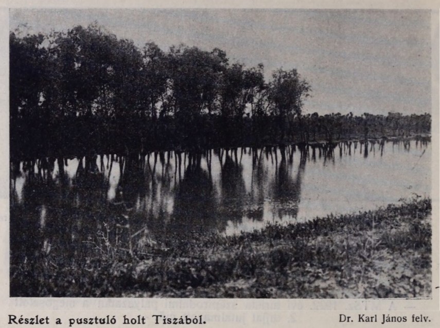 Közvetlenül a vasúti töltés mellett, a város felé, széles mocsaras rétet találunk. Mélyebb helyeit még víz borítja. S itt a fehér tündérrózsa teregeti szét nagy leveleit s a vízitök sárga virága, mint valami kis csónak, csalogatja magába az ide-oda röpködő bogárvilágot. A sekélyebb tócsákban mindenféle apró vizi jószág sürög-forog. A magasabb és éppen ezért szárazabb helyeket térdig érő sár takarja, helyenkint pedig embermagasságú gyékény- és kákafoltok díszítik. Az a rövid óra, amit bebolyongásra és néhány felvétel elkészítésére szánunk, igazán megéri a fáradságot. Más tájakon úgysem láthatunk ilyet. Túl a vasúti töltésen teljes pompáját tárja elénk a Tisza árvíz-területe. A természet és az ember remekműve váltakozik itt lépésről-lépésre. Igazán nem is tudjuk hamarjában, hogy hol kezdjük a szemlélődést. A gát széles tetején nagyszerű út vezet tova, mellette telefonvezeték. Túlságosan modern terület ez turistának. Gyerünk másfelé! Nyugatra végeszakadatlan s gabonával bevetett területek csatlakoznak a gáthoz, kelet felé azonban annál vadonabb a vidék. Utunkat erre vesszük. Közvetlenül a gát lábánál mély gödrök, ú. n. „kubikgödrök“ sorakoznak egymás mellé. Árvíz alkalmával ezek is megtelnek, most azonban alig van bennük víz. Itt-ott csillog egy-egy kis tócsa, millió és millió szúnyoglárva bölcsője. Pompás növényzet tarkítja környéküket, terebélyes koronájú fűzfák alatt embermagasságú Oenanthe-k, izmos, sárga Irisek üdvözölnek. Kedvelt fiatalkori olvasmányom: Rudyard Kipling indiai históriái jutnak eszembe, amint keresztül törtetünk rajtuk. Valóságos kis dsungel. A kubikgödrök övén túl egyszerre sima a talaj, de annál nehezebb a járás. Erdő sűrűségűvé lesz a fűzfák csoportja, a földön pedig összefüggő hálózatot alkot a földi szeder (Rubus) kúszó szára s liánszerűleg befon mindent, s helyenkint lehetetlenné teszi az áthatolást. S mi mégsem zúgolódunk, arcunkon az elégedetlenségnek a legkisebb nyoma sem látszik. Feketéllő terméstől roskadoznak ugyanis ágai s megfizethetetlen üdítőül szolgál az eltikkadt vándornak. Néha-napján verődik csak errefelé ember, s így bőven jut a készletből mindnyájunknak. De ez a boldogság sem tart sokáig. Ritkul ugyanis a liget, nedvesebb lesz a talaj s néhány lépésre előttünk a holt Tisza medre. Mozdulatlan, nyugodt víztükör tekint reánk. Az első pillanatban mintha a halál országa volna. De halga csak! Megriasztott vadkacsák szállnak fel ... egy-egy kis halacska veti fel magát a vízből ... nagyfejű szitakötők — a csendes vizek éber pilótái — berregve szállnak ide-oda. Tehát mégis van itt élet! Kis kerülővel elérjük a holt Tisza szélét. Néhány nappal ezelőtt víz alatt volt még ez a terület is, de a nap sugarai átalakították olyan kopár, fátlan folttá, hogy bármelyik sivatagnak díszére válhatna. Kopog, zörög alattunk az össze-vissza repedezett talaj, mint a rossz aszfalt. Dicső, büszke folyam-fenék, de szomorú sorsra is jutottál! A nagy vizekből visszamaradt iszap és egyéb hordalék feltölti lefolyástalan medredet, majd a fűz- és nyárfacsemeték ütnek rajtad tanyát. Holdvilágos éjszakákon halk susogásba kezdenek és úgy viselkednek, mintha ők volnának az őslakók.